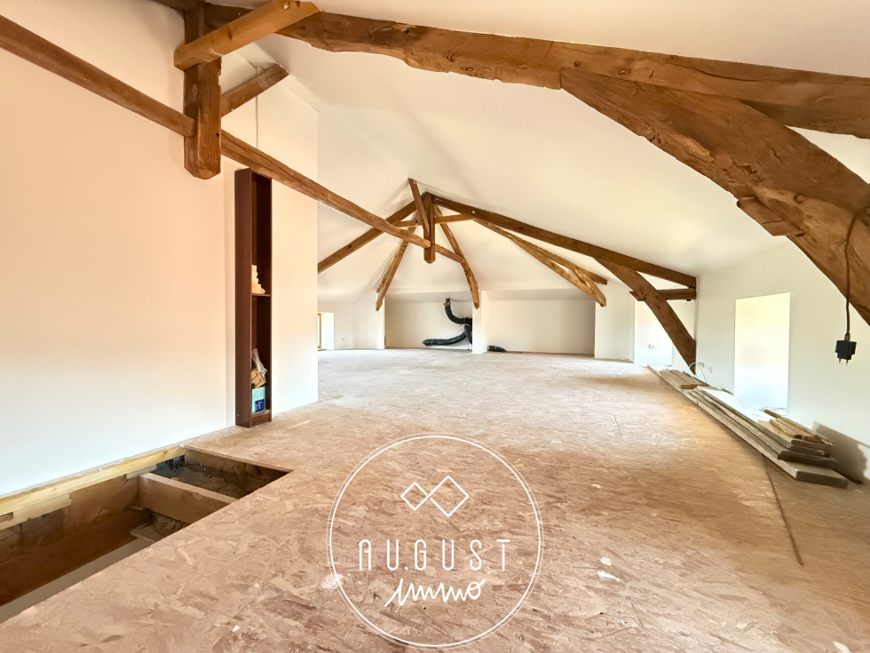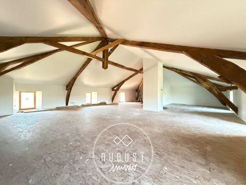 Au second niveau, laissez-vous séduire par un plateau remarquable, entièrement isolé, où la charpente apparente, majestueuse, apporte un cachet rare et une atmosphère unique. Un espace à aménager selon vos envies (suite parentale, bureau, salle de jeux…).